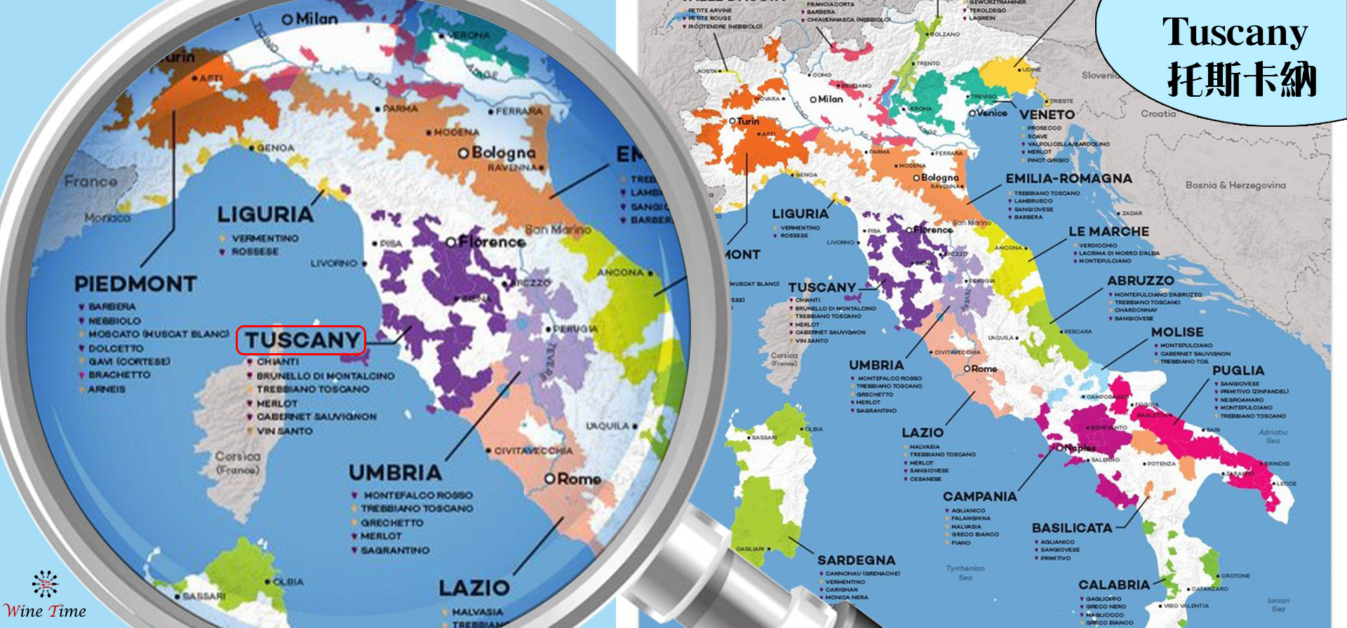 托斯卡納(Tuscany)——義大利(Italy)最知名的葡萄酒明星產區,區內有多家知名葡萄酒莊園,例如布魯奈羅(Brunello)和古典基安蒂(Chianti Classico)等。產區共有11種DOCG和34種DOC葡萄酒,還有很多款IGT和VdT等級的葡萄酒,每款葡萄酒都非常高質量,令人印象深刻。