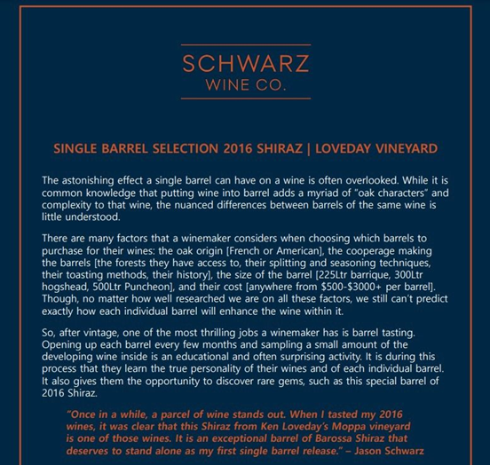 Nitschke Block Shiraz是傑森·施瓦茨(Jason Schwarz)於2001年生產的莊園第一款葡萄酒,並且由單一葡萄田的果實釀造而成,其樹齡高達53年。