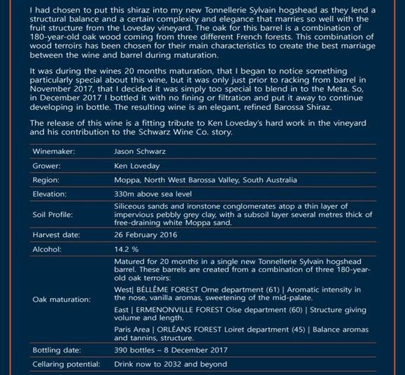 Schwarz The Grower Shiraz 此酒的果實生長在巴羅莎山谷(Barossa Valley)六個子區域Bethany,Vine Vale,Stonewell,Light Pass,Marananga和Hallett Valley ,來自11個葡萄園的葡萄種植者,每個次區域具有自己的獨特特徵,為最終融合的成品酒增添個性。