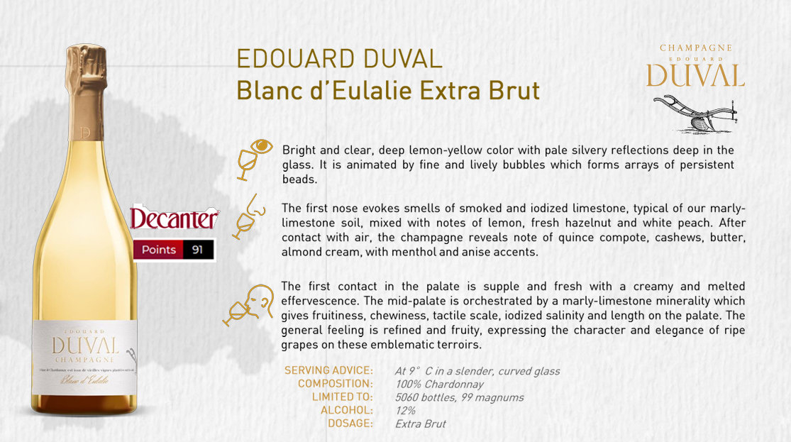 Edouard DUVAL 香檳採用極少的干預、長時間的地窖陳釀和低劑量的生產方式,以最好地表達獨特的風土條件並實現指導願景:「在我們的每款香檳中延續尊重克魯尼修道院傳統的葡萄酒種植。