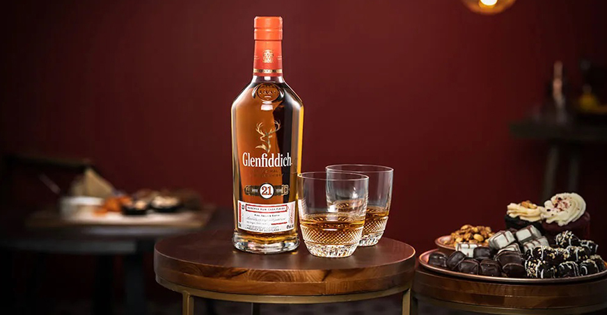 Glenfiddich 21 Years Old Single Malt Whisky (Rum Cask) 將21年的格蘭菲迪注入原儲存古巴蘭姆酒的木桶,以吸取蘭姆酒的特性,香味強烈、熱情而甜美,像是花香中帶有絲絲香蕉、太妃糖、皮革和橡木的味道。風味初時柔軟,繼而爽口有生氣,絲絲煙味、胡椒味及萊姆味與持久溫暖的餘味互補,和古巴雪茄是絕佳的搭配。