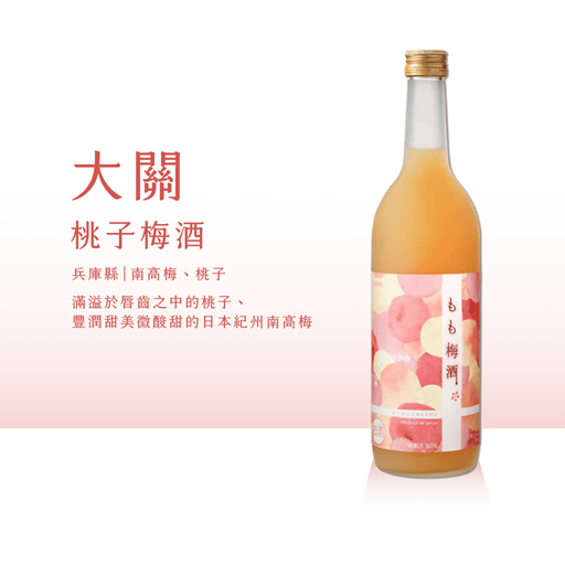 簡介: 大關桃子梅酒選用和歌山縣著名的南高梅和熊野的優質名水精心釀造而成,並特別添加了30%同樣來自歌山縣生產的桃子汁。其果香濃郁,口感溫潤,桃子的甜香與梅子的柔和酸味完美交融。